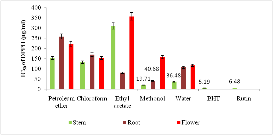 Phytochemical screening of the plant parts revealed the presence of flavonoids, tannins, saponins, carbohydrates, and Phytosterols are high in stem compared to root and flower.