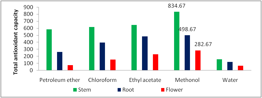The total antioxidant capacity (TAC) of the plant extracts was determined using a phosphomolybdate assay (fig. 2). The assay activity is based on the reduction of molybdenum (VI) into molybdenum (V) in the presence of a reducing agent (antioxidant), forming a green phosphomolybdate(V) complex, and evaluated spectrophotometrically at 765 nm. Fig. 2. Among different parts used, the methanol extract of the stem has shown a better antioxidant capacity (834.67 mg AAE/g extract) followed by ethyl acetate. This order of activity from polar aqueous to nonpolar petroleum ether extract is quite normal since the polar solvents have a much stronger ability to dissolve and extract polar phytochemicals. The lower antioxidant capacities of the flower extracts. Root part of methanol extract also showed higher antioxidant capacity (498.67 mg AAE/g extract) as compared to other solvent extracts. Thus, the antioxidant capacity observed from the extracts of S. brunonianum can be correlated with its free radical scavenging activity equivalent to that of natural antioxidant ascorbic acid.