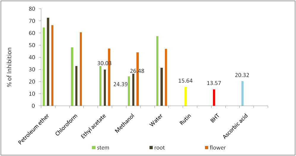 Nitric oxide (NO) has a significant role in various types of inflammatory processes in the animal body. Scavenging NO activities is detrimental to human health. The scavenging activities of various samples on nitric oxide were analyzed and the percentage of scavenging activities of stem, bark and fruit of S. brunonianum are shown in (fig. 3). The Nitric oxide radical scavenging activity of stem, root and flower extracts of the plant showed greater % of inhibition, especially in methanol extract of the stem (24.39µg/ml), root extract (26.48µg/ml) followed by ethyl acetate stem extract (30.03µg/ml). The scavenging activities of all extracts were comparable with that of Rutin and BHT. The scavenging of nitric oxide assay has shown the relevant inhibitory concentration in the methanolic extract of the bark sample. The result indicates that the sample extracts might contain some compounds which can inhibit nitric oxide and offers scientific evidence for the utilization of the plant in the inflammatory condition.