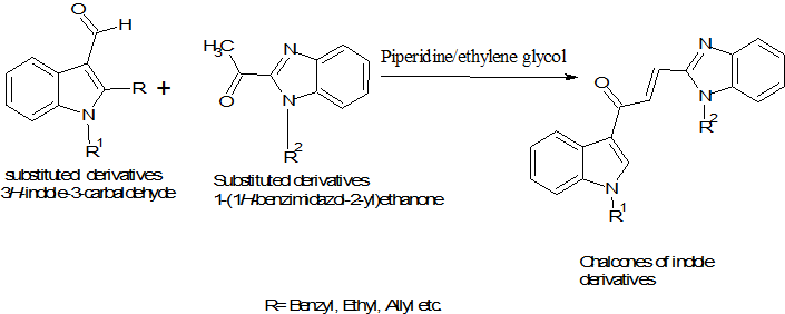 Now a day’s 2-acetylbenzimidazole molecule and indole-3-carboxaldehyde are associated with a wide range of biological activities such as anticancer, anti-inflammatory, analgesic and anthelmintic etc. The N-substituted fused heterocyclic compounds are usually biologically active and may be used as potential therapeutic alternatives to the antitumor drug.