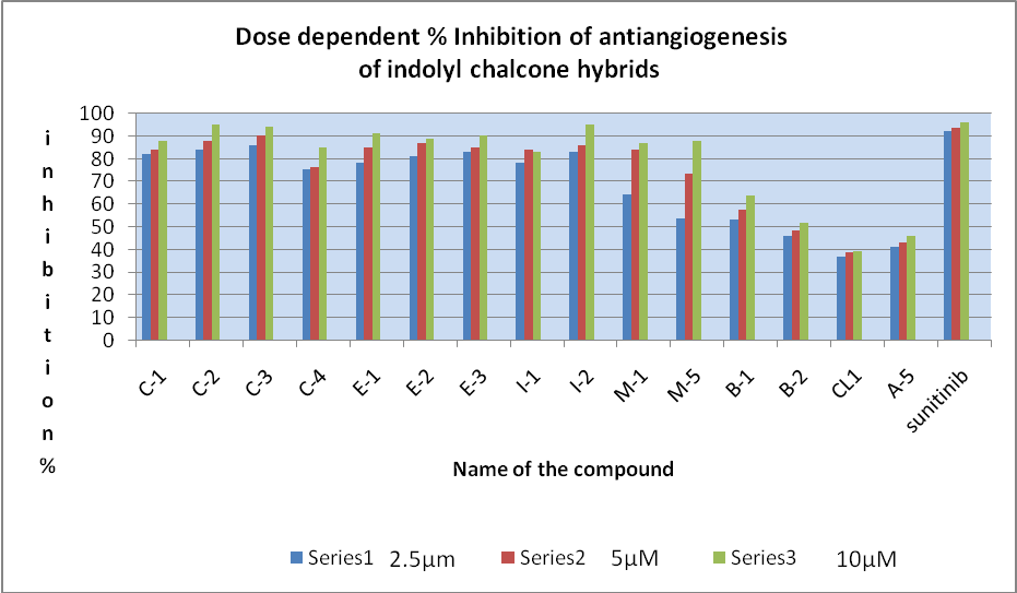 Conclusion: The synthesized Indolylchalcones as shown in the graph possess very good dose-dependent anti-angiogenic activities. The potency of anti-angiogenetic activity shows that methyl>Ethyl>Cl-benzyl>Benzyl>Isobutyl. 2-acetyl benzimidazole analogs have possible future scope to develop as potent angiogenesis inhibitors.