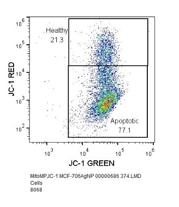 Flow cytometry was used in apoptotic study (BD™ MitoScreen Kit) according to the instructions of the manufacturer. MCF-7 cells at a density of 3 x 105 cells/2 ml were cultured in a 6-well plate followed by incubation in CO2 incubator overnight at 37 °C for 24 h. The cells were treated with (IC25) of MC-AgNP, Cisplatin (80 µg/ml) as the positive control and one of the wells was left untreated to be used as the negative control. The cells undergone trypsin treatment with 200 µl of trypsin-EDTA solution after 24 h of incubation. All the cells were harvested and centrifuged for 5 min at 300 × g (25 °C). After decanting the supernatant, pellet was re-suspended in PBS to which about 0.5 ml of freshly prepared JC-1 working solution was added followed by incubation for 15 min at 37 °C in a CO2 incubator. The cells were washed twice with 1X assay buffer, re-suspended and centrifuged at 400×g for 5 min. The sample was analysed by Cytomics FC500 flow cytometer (Beckman Coulter, USA) after re-suspension of the cell pellet in 0.5 ml of 1X assay buffer.