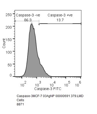 A 6-well plate was used for seeding MCF-7 cells at a density of 3 x 105 cells/2 ml. And the cells were treated with (IC25) of MC-AgNPs (experimental test compound), after 24 h of seeding. MCF-7 cells were treated with Cisplatin that served as the positive control while the untreated cells served as the negative control. The cells were provided with trypsin treatment after incubation of 24 h followed by centrifugation at 300 × g at 25 °C for 5 min and the obtained pellet was re-suspended in PBS. This was followed by the addition of 0.5 ml of 2% paraformaldehyde solution and incubation for 20 min. The cells were then washed with 0.5% BSA in 1X PBS. Triton-X 100 (0.1%) in 0.5% BSA solution was added to the cells. After 10 min incubation, it was washed twice with 0.5% BSA in 1X PBS. Then 0.5% BSA in 1X PBS and 20 µl FITC rabbit anti-active caspase-3 IgG was added according to manufacturer’s instructions. It was mixed thoroughly by pipetting and incubated for 30 min in the dark at room temperature (25 °C). 0.5 ml of PBS was added after washing the cells, mixed thoroughly and analysed using Cytomics FC500 flow cytometer (Beckman Coulter, USA).