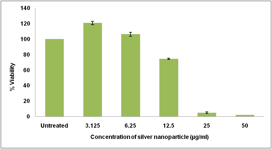 MCF-7 cells were plated to 96 well microtitre plate and the count was adjusted to 10,000 cells/well, using DMEM HG medium. To each well, 200 μl of the cell suspension was added and the plate was incubated for 24 h at 37 °C and 5% CO2 atmosphere. The cells were treated with 200 μl of different concentrations (25, 12.5, 6.25, 3.12 and 1.56 µg/ml) of MC-AgNP for 24 h followed by addition of 10% MTT reagent to get a final concentration of 0.5 mg/ml and was incubated for 3 h at 37 °C. The culture medium was removed completely without disturbing the crystals formed. Then 100 μl of solubilisation solution (DMSO) was added to the wells and the plate was gently shaken in a gyratory shaker to solubilize the formed formazan. The absorbance was measured using a microplate reader at a wavelength of 570 nm and at 630 nm. The percentage growth inhibition was calculated and concentration of MC-AgNP needed to inhibit cell growth by 50% (IC50) was obtained from the dose-response curve for MCF-7 cell line [24]. The experiment was performed in duplicates and the results were expressed as mean±standard error. Data is statistically analysed by one way ANOVA where means not sharing a common single letter found to be significantly different at p ≤ 0.05.