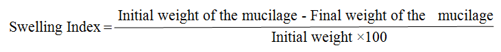 One gram of okra mucilage powder was accurately weighed and transferred to a 100 ml stoppered measuring cylinder. The initial volume of the powder occupied by the measuring cylinder was noted. Then distil water was added to make up the volume to 100 ml. The stoppered cylinder was shaken gently and set aside for 24 hour. The volume occupied by the mucilage was recorded after 24 h [18].