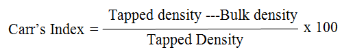 Calculation of Carr’s Index was found out from the value of bulk density and tapped density. Carr’s index determination were performed as below equation: