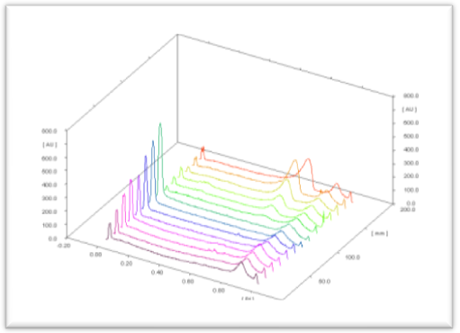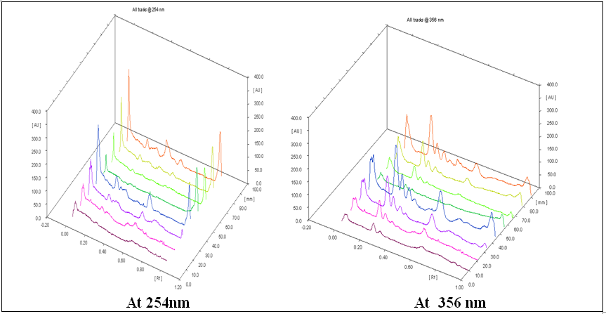 The analysis was carried out by application of the 5 mg/ml methanolic extract of Okra mucilage and 10 mg/ml ethanolic extract of Okra mucilageon HPTLC Precoated silica gel 60 (10 cm×10 cm) F254 plate [Merck, Darmstadt, Germany, 1.05554.0007] at different volumes 5,10,20 and 40 µl. were applied with proper supply of nitrogen gas to provide an inert environment to the sampling process. The plate was developed using the mobile phase Ethyl acetate: Acetic acid: formic acid: water: :100:11:11:25in CAMAG twin trough glass Chamber (20×10 cm)up to the distance of 85.8 mm at room temperature. The plates were air-dried and viewed using CAMAGTLC Scanner at wavelength 254 nm and 356 nm. 8 numbers of tracks were studied and the distance between the tracks maintained as 11.4 mm with band length of 6.0 mm.