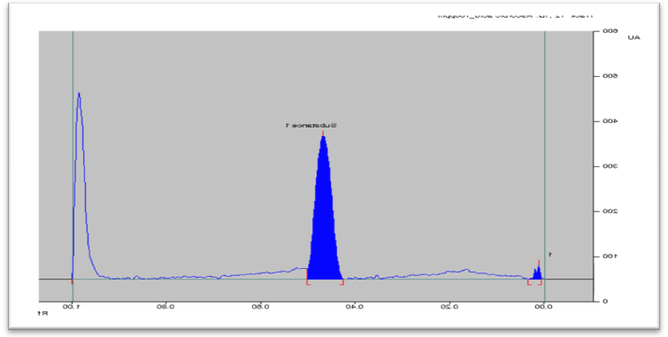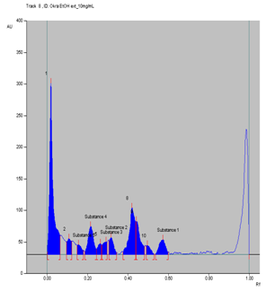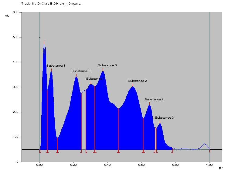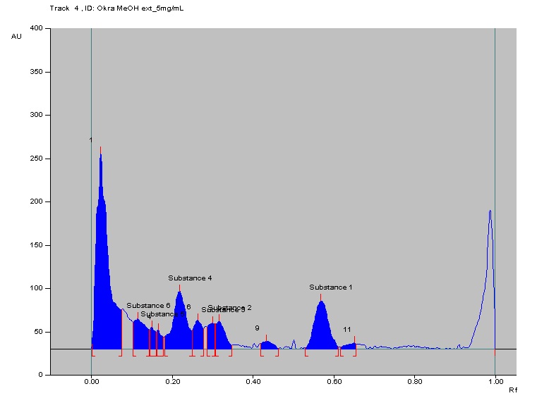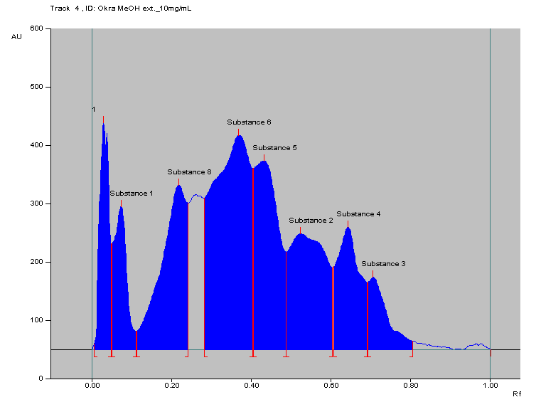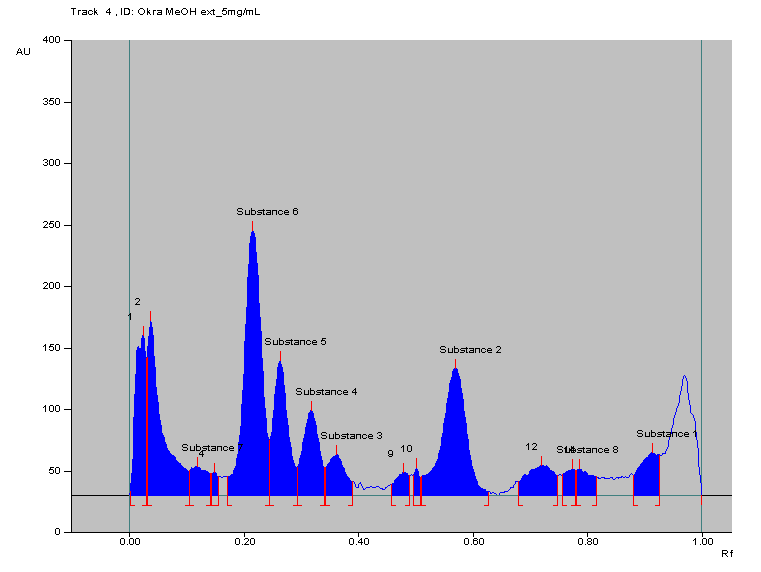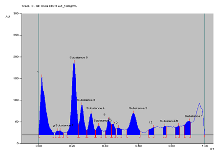 The Rf value for substance 1in the TRACK 10 of standard ascorbic acid100 ppm was found to be 0.60 and peak area 3094.9. The Rf value of substance 1in the TRACK 6 of Okra Ethanolic ext 10 mg/ml in the second peak of the sample coinciding nearly to standard Ascorbic Acid 100 ppm was found to be 0.62 and peak area 278.6. The fifth peak of substance 1 in TRACK 2 Okra Methanolic ext 10 mg/ml was found to be 0.63 and peak area 369.8 coinciding nearly with standard Rf value(0.60) and peak area 3094.9of Ascorbic Acid 100 ppm at peak 8 of Track 10.