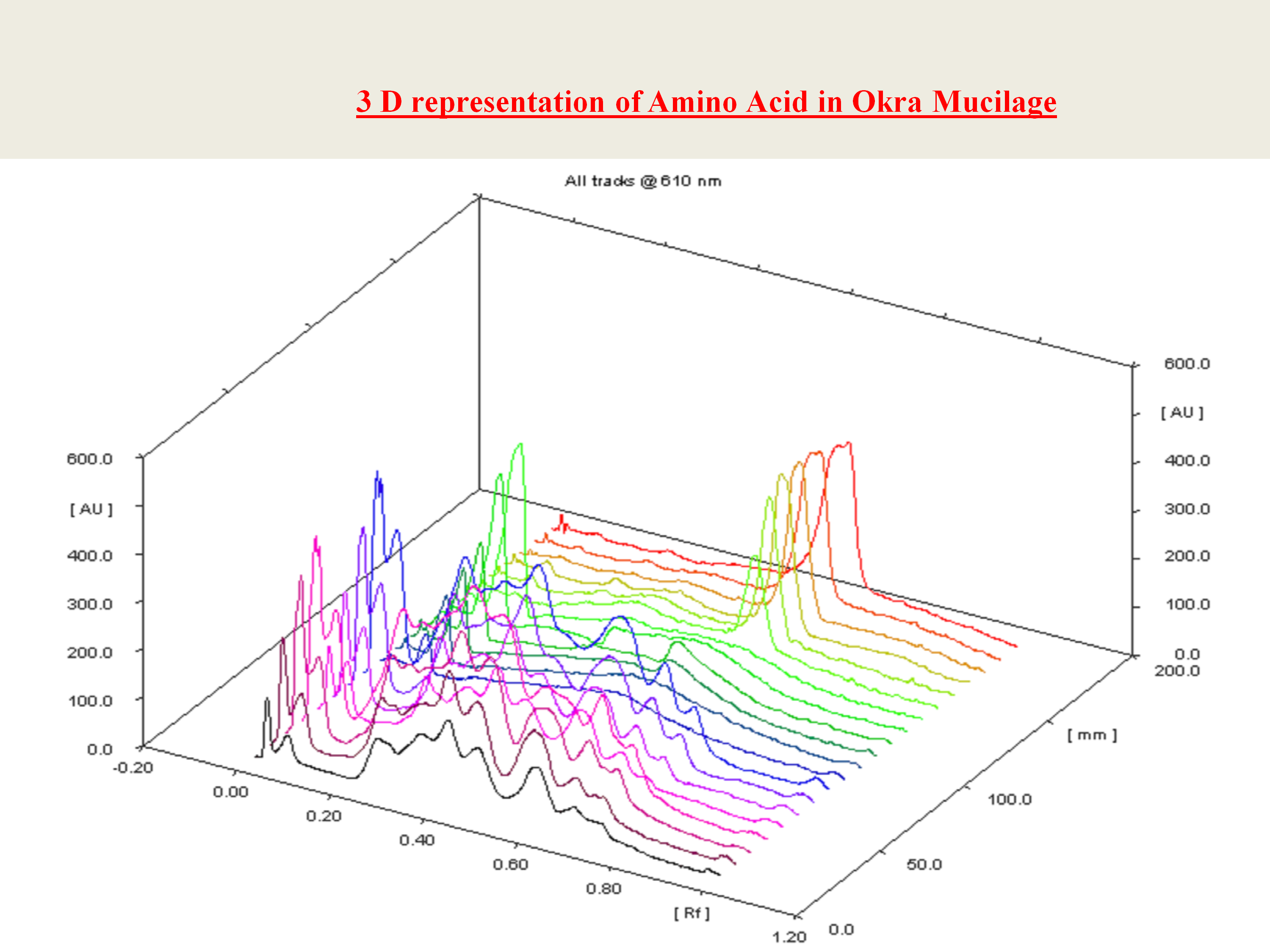 Methionine (100 ppm) and Arginine (100 ppm) standards and extracts of Okra mucilage were spotted on a HPTLC Precoated silica gel 60 (10 cm×10 cm) F254 plate [Merck, Darmstadt, Germany, 1.05554.0007] at different volumes of 10 and 30 µl. Ascending development of the plate was carried out to a distance of 84.2 mm at room temperature with a mobile phase of n-butanol: Acetone: Acetic Acid: Water (7:7:2:4 v/v/v/v). After development, the plates were air-dried and dipped in 0.3% ninhydrin in n-butanol solution and the plates were dried in hot air oven maintained at temperature 120 °c for 20 min. The quantitative analyses of the compounds were done by scanning the plates at 610 nm with a CAMAG TLC scanner 3 operated by win CAT software at 20 nm/s. The total 20 numbers of tracks with a distance of 11.0 mm were scanned and the detection of spots with matching Rf values of the amino acids were calculated.