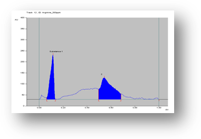 Peak table with retention factor (Rf) values, height and area of standard Arginine 100 ppm at 610 nm