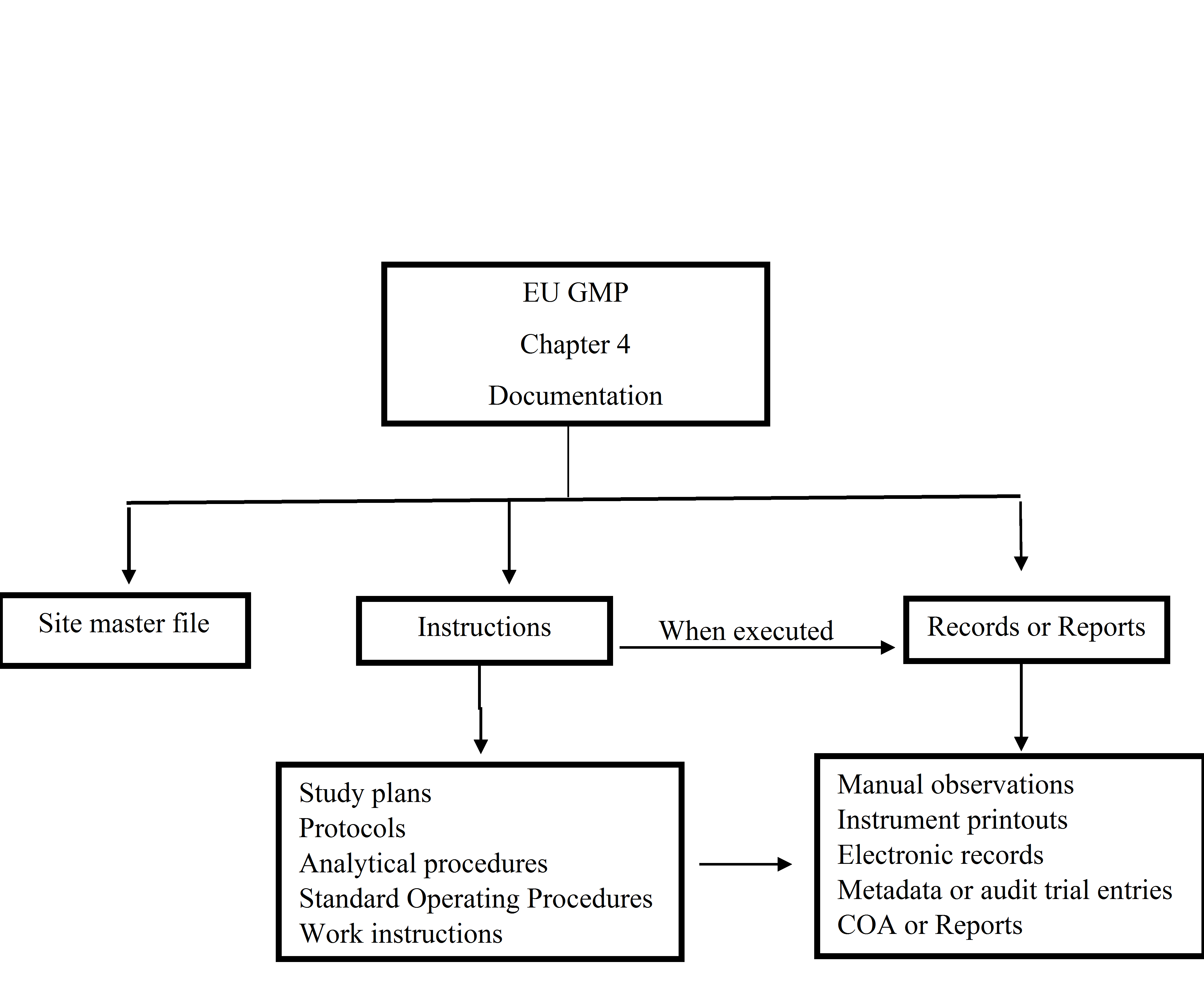 EU GMP Chapter 4 provides guidelines for GDocP. Good Documentation is an integral part of the QA system and is necessary for operating following GMP requirements [7]. To monitor and record GMP enforcement there are two main forms of documents used: 1 Instructions (directions, requirements), 2 Records or Reports. The implementation of an instruction results in the production of records or reports as shown in fig. 1. Beneath both Instructions and Records or Reports, types of documents are described in more detail. It is the presence of correct and reliable reports that prove that standards have been followed, and therefore the work complies with GMP regulations.