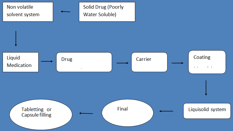 Mostly newly developed drugs are Lipophyllic which generally faces challenges like solubility and bioavailability. Numerous methods like saltformation, [1] cosolvancy, [2] complexation, [3 ]micronization, [4] melts onocrystallization, [5, 6] lyophilization, [7], solubilization bysurfactants [8] solid solution [9], drug solution incorporation in soft gelatin capsule [10] liposomes, nanoparticles, SEEDS, [11] imroves the dissolution of the drugs of low solubility These techniques have some limitations such as hygroscopicity, creating solubilityproblem [12, 13]. The word liquid medicine means oily liquid drugsolution or suspension held as liquid vehicles in appropriate nonvolatile solvent systems. “Liquisolid Tablets” or “Liquisolid Compacts” not involve drying and evaporation [14]. In tabletted and capsulated form drug is embedded in liquid [15] so this technique is known as “PowderSolution Technology”. Greater surface area and adsorption of carrier materialto adsorb adequate space in liqyidmedicine. Usually Carrier adsorb liquid on its surface with a very large surface area and coating material forms the layer on carrier particles represented [16] [fig. 1.