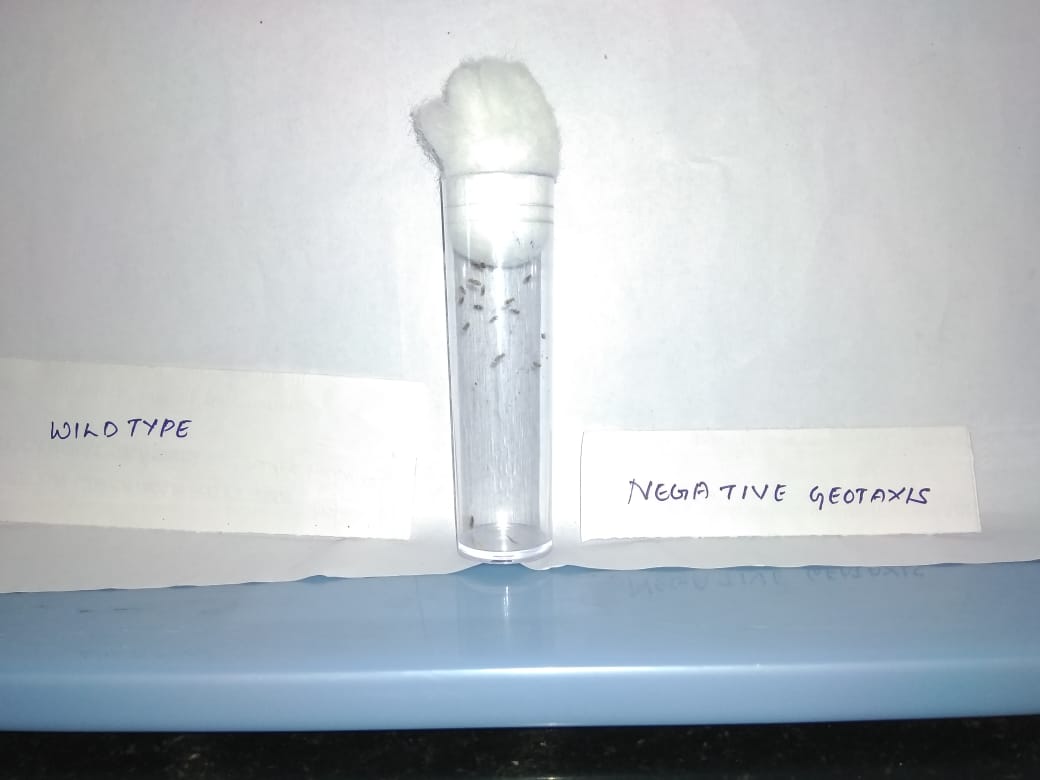 About 30 flies from WT were anesthetised and positioned in a vertical glass column (12 cm X 1.5 cm) sealed at one end with cotton. After a short recovery period of five minutes, flies were softly trapped to the bottom of the column. Following one minute, flies that touched the top of the column and flies that continued to remain in the bottom were counted separately. Data was expressed as percent flies crossed beyond the distance of 13 cm in 60 s of interval [41, 11]. Each assay was repeated for all the four groups of flies and mean±SD was calculated (fig. 1a).