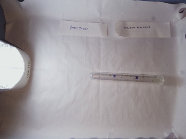 The vial was segmented into 3 compartments, in a dark room vial containing about 30 flies plugged by cotton and the test tube were left separately for 30 min. And hence flies were allowed to adapt to darkness. The vial with flies was softly pounded down to keep the flies at the away from the cotton, then the cotton was detached, and the vial was attached to the test tube by a connector. This set-up was horizontal and perpendicular to the horizontal light source kept at 15 cm distance. The light was then turned on. The flies were counted every minute for each quarter of the apparatus. In a control set-up, the apparatus was kept 15 cm away from and parallel to the light source. Each assay was repeated in all the four groups and mean±SD was calculated (fig. 1b).