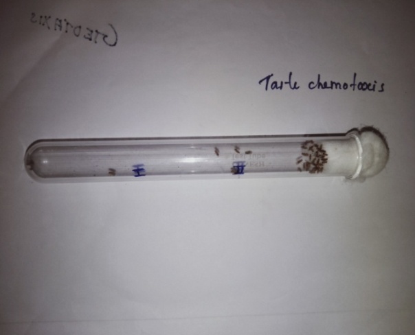Sucrose (a non-volatile compound standardly used in taste chemotaxis) has been used in this assay. About 20-25 flies were placed in a test tube (18 cm × 1 cm) and are divided into 3 equal compartments. The cotton plug was soaked in 1 ml of 0.1% sucrose and plugged in the test tube. After one minute, the number of flies, present in each compartment was counted and the result was expressed as a percentage. The test was repeated for separate three sets of flies (fig. 1d).