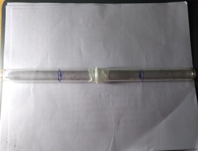 Two vials (15 × 1.5 cm) were used in the study. One vial was heated to a temperature of 45 ° C and was instantly connected to a vial by means of transparent tape comprising of 20-25 flies. The connected vials were compartmentalized into three equal zones (I, II and III–compartment III heated zone). After one minute, the number of flies present in each compartment was counted and the result was expressed in the percentage of total flies present. The test was repeated for separate three sets of flies (fig. 1e).