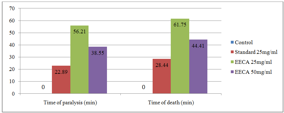 Time taken for paralysis and death of the worms by EECA can correspond with observations of the previous anthelmintic studies on the plant extracts [25]. The extract is more effective at 50 mg/ml but the extract at either dose was found to be less effective than the standard drug.