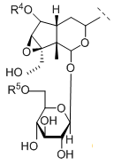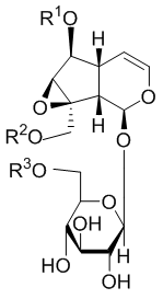 Iridoid Glycoside; Catalpol: (1aS,1bS,2S,5aR,6S,6aS)-6-Hydroxy-1a-(hydroxymethyl)-1a,1b,2,5a,6,6a-hexahydrooxireno [2′,3′:4,5]cyclopenta[1,2-c]pyran-2-yl β-D-glucopyranoside, (6) |