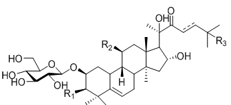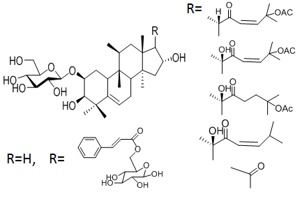 These are triterpenoid compounds containing a cucurbitane skeleton characterized as 9β-methyl−19-nor lanosta-5-ene,. Cucurbitacins possess a wide range of biological activities and the present in the form of β-glycosides in plants. A large number of cucurbitacin glycosides have been isolated from Picrorhiza species, mainly from P. kurroa [49, 50].