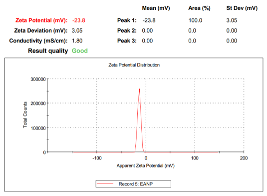 Particle Size Distribution and Zeta Potential Analysis. The lyophilized EA-NPs were reconstituted with Milli-Q water prior to the measurements. The average particle size, size distribution, and polydispersity index (PDI) of the prepared nanoparticles were determined by Photon Correlation Spectroscopy using a Malvern NanoZS (Malvern Instruments, Worcestershire, United Kingdom). Zeta Potential was measured at 25 °C using the same instrument. All the measurements were performed in triplicate; average values of three experiments were calculated and reported [6].
