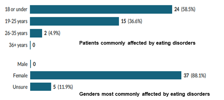 Questions 5 and 6 asked participants about their thoughts on the age and gender most commonly affected by eating disorders with 88% of participants selected the female gender. Most people (58%) thought that the condition most commonly affected those aged 18 or under (fig. 1).