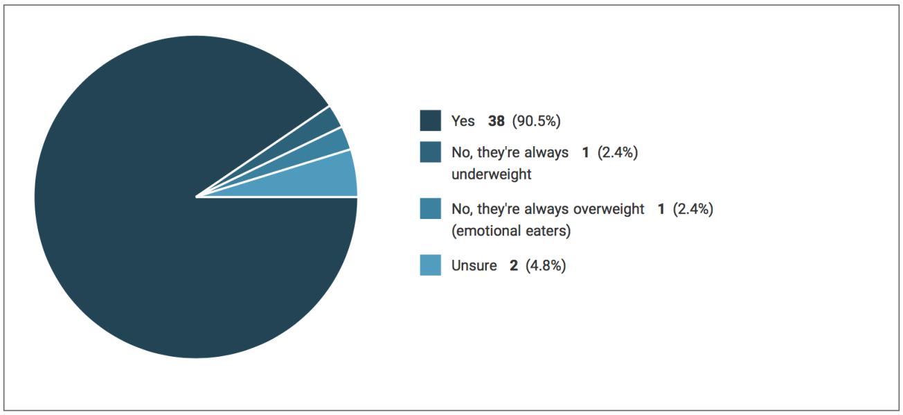 Question 12 was produced to ask pharmacy students whether being of a normal weight meant patients didn’t suffer from eating disorders, 90% of participants said eating disorders could occur in those of normal weight (fig. 4).