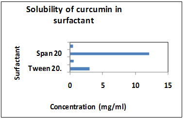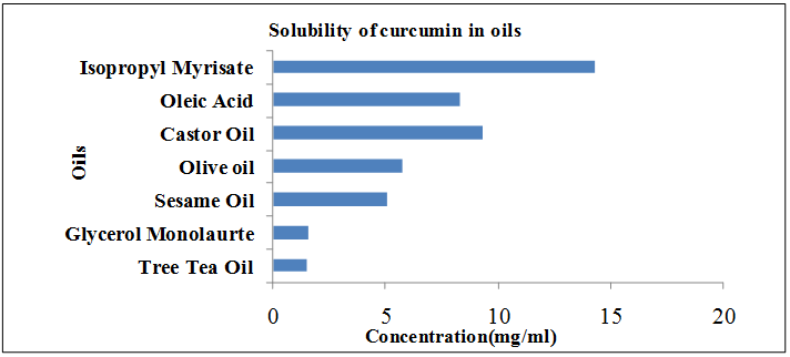 Fig. 1A: Solubility of curcumin in oils B: Solubility of curcumin in surfactant C)