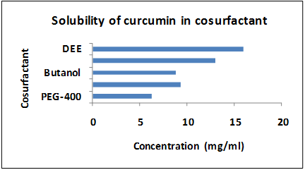 In the solubility study of curcumin in various oils, surfactants, and co-surfactants, it has been found that maximum solubility of curcumin was found to be in isopropyl myristate, Tween-80, and Isopropyl alcohol. Based on the resulted data of the solubility study, isopropyl myristate was selected as oil phase, and Tween-80 and Isopropyl alcohol selected as surfactant and cosurfactant, respectively for the construction of pseudoternary phase diagram and formulation of the microemulsion.