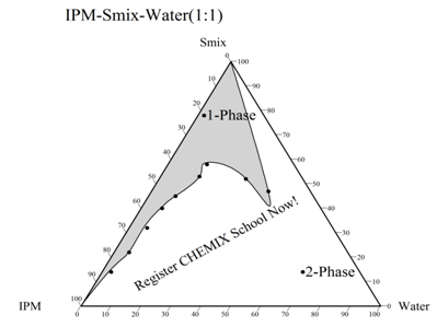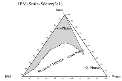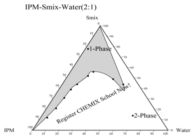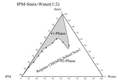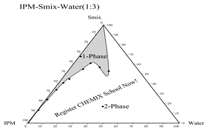 The km value (ratio) for stable microemulsion was found out by the water titration method at various ratios of surfactant and cosurfactant (1:1, 2:1, 3:1, 1:2, and 1:3) and thereafter, the pseudoternary phase diagram was designed. The optimized value is selected from the pseudoternary phase diagram which shows the highest microemulsion (1 phase) area and it is further used for microemulsion preparation [13].