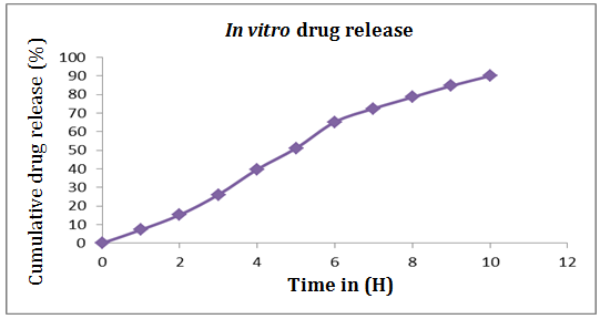 The in vitro drug diffusion study of curcumin-loaded microemulsion was performed by using the Franz Diffusion cell apparatus in phosphate buffer solution of pH 5. The drug release from microemulsion formulation exhibited 89.96% drug release in 10 h and the result depicted in fig. 6. This clearly indicates that the microemulsion has enhances the solubility of curcumin and it has the ability to permeate through the skin. It was observed that there was an increased permeation of curcumin across the membrane by using isopropyl myristate as oil phase in microemulsion formulation.
