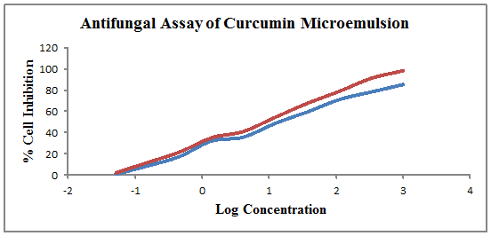 The results showed that curcumin-loaded microemulsion and standard Fluconazole showed IC50 value at 19.34 µg/ml and 38.12µg/ml respectively and which indicate that curcumin emulgel is most effective against Candida albicans than standard Fluconazole drug. The probable reason will be the incorporation of curcumin into the microemulsion based system and further fabricated into emulgel which increase the permeability rate of curcumin across the membrane. The result also revealed that the Candida albicans develop resistance against fluconazole and other antifungal drugs, thus curcumin is effective antifungal agent against Candida albicans as compare to the synthetic drugs.