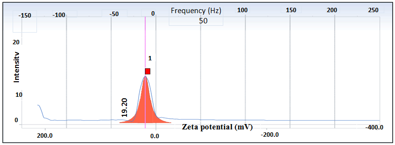 The average globule size, polydispersity index, and zeta potential of the curcumin-loaded emulgel were determined by dispersed gel into distilled water, and kept for sonication (20-30 s) and after that for vortexed for 1 min to make sure that to minimize the aggregation if present in microemulsion gel [19]. After that, the sample was analyzed for average globule size, polydispersity index, and zeta potential by using Zetasizer (Nano ZS: Malvern Instruments. UK), with an angle of 90 °C at 25 °C. The sample analysis performed triplicate for the confirmation of reproducibility in results [27].
