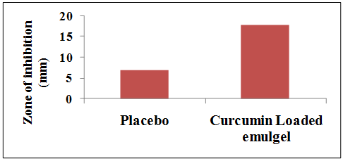 The value of zone of inhibition for curcumin-loaded emulgel and placebo gel was found to be 18 mm and 7 mm (fig. 12), respectively and curcumin-loaded emulgel had a remarkably greater zone of inhibition and superior in vitro antifungal activity against Candida albicans compared to the placebo gel. From the stability study, we found that there is no change in the appearance, pH, viscosity, Spreadability, and drug content of Curcumin-loaded emulgel, and maintained their efficacy and potency.