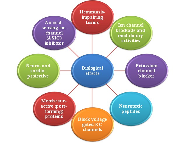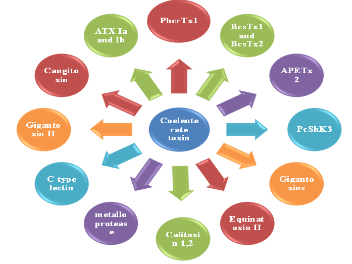 Most of the coelenterates secrete venom that is a diverse arsenal of peptides and proteins used in self-defense and to immobilize the prey. These low molecular weight toxin peptides interact to voltage-gated sodium and potassium channels. These toxins fire membranes and form and accelerate active passage of ions which pass using the electrochemical gradient across the membrane itself. Coelenterate toxins show diverse biological activity such as anti-angiogenesis effects and cytolytic activity against human myelogenous leukemia and cancer cell lines. These pore-forming toxins show action much similar to actinoporins and cause hemolysis. Sea anemone B. verrucosa contain metalloproteinases and neurotoxins. These also show Kunitz-type protease inhibitor and pancreatic α-amylase inhibitor activity. These also show anti-pathogenic effects against microbes such as viruses, bacteria, protozoan and fungal species. These show anti-helminthic activity, analgesic effect, anti-diabetic activity and immunomodulating activity are of great of pharmacological and biotechnological interest. These could be used for the generation of new highly effective drug molecules for the treatment of various human diseases. These toxins could be used as a natural source for the development of alternative medicine.