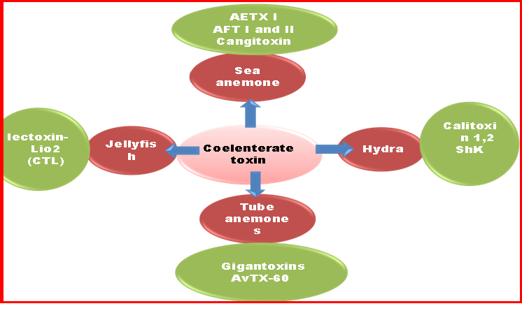 Coelenterate venom toxins were evolved during very long evolutionary period. The origin of venom shows biological relevance as it was evolved in response to predator attack and for feeding to immobilize or kill the prey. In coelenterates defense organs were evolved due to environmental adaptations and survival competition during long evolutionary selection and mutational mechanisms. Both production of venom, its infliction, intelligence, and genetic coherence seems integration of genetic system and environmental change [1]. Coelenterates have been divided in five main classes of toxic marine animals: Anthozoa, Cubozoa, Scyphozoa and Hydrozoa. They are the largest and oldest phylum of toxic marine animals which use venom for their territorial protection from enemies and hunting the prey [2]. Coelenterates use toxins for prey acquisition, and to deter potential predators (with neurotoxicity and cardiotoxicity effects) and to fight territorial disputes (table 1).