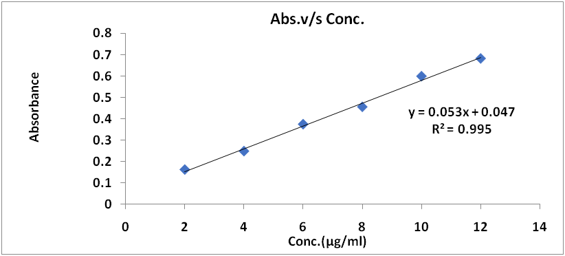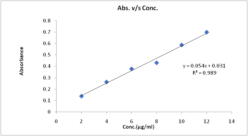 The calibration curve of Rosuvastatin Calcium was found to be linear at 241 nm in phosphate buffer (pH6.8) in the concentration range of 2-12(µg/ml), which obeys Lambert-Beer Law. The absorbance at different concentrations is represented in fig. respectively.