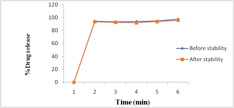 Accelerated stability tests were conducted on produced solid dispersion in amber coloured screw sealed bottles for one month at 402 ᵒC and 755 percent RH, as per ICH standards. In a stability chamber, solid dispersions were maintained. Physical characterization, content uniformity, and in vitro dissolution tests were performed on samples taken at regular intervals of 7 d, 14 d, 21 d, and 30 d. To compare dissolution profiles, the similarity factor (f2) was employed. The profiles of disintegration when f2 is between 50 and 100, dissolution profiles are thought to be comparable. A similarity factor (f2) was derived using the following formula to compare the dissolution profiles of C1 formulation before and after stability testing [14].