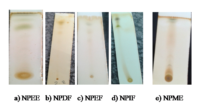 Thin layer chromatography of the Neptunia prostrata methanolic extract NPME and Neptunia prostrata ethanolic extract NPEE was carried out. The NPEE and its fractions were also carried out for TLC study such as (NPIF Neptunia prostrata isobutanol fraction, NPEF Neptunia prostrata ethylacetate fraction, NPDF Neptunia prostrata dichloromethane fraction). It was performed in a prepared silica gel G coated alumina plate cutted suitably into 6 cm in length and 2 cm in width. The extracted material was dissolved in a minimum amount of their respective solvent used and spotted on the pre-activated plates using capillary tube, TLC was run in petroleum ether: ethyl acetate (2:8) mobile phase system. Chromatogram was developed and dried in air. The extracts were chromatographed on silica-coated TLC plates (Sigma-Aldrich) [22].
