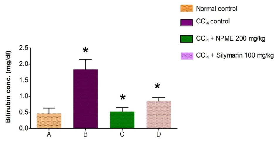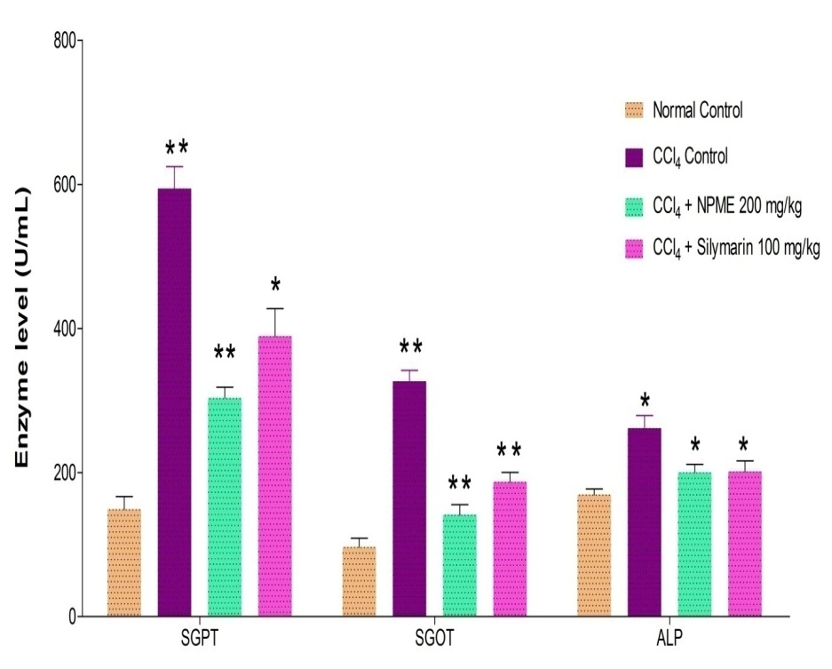 Biochemicals analysis: Serum levels of SGOT, SGPT, ALP and total bilirubin serve as hepatotoxicity indexes. CCL4 administration produces significant elevations of serum as compared to the normal control group indicating liver damage. Treatment of rats with NPME (200 mg+CCL4) caused a significant reduction in the values of SGOT, SGPT, ALPand total bilirubin (fig. 2).