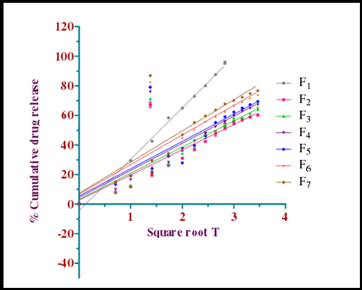 Fig. 9: Comparative in vitro release profile of moronic acid TDDS according to Higuchis plot