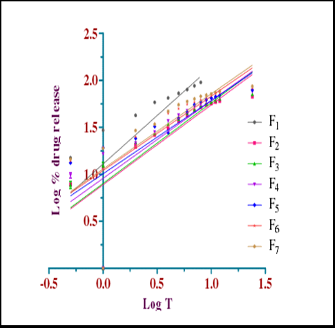 Fig. 10: Comparative in vitro release profile of Moronic acid TDDS according to peppas plot