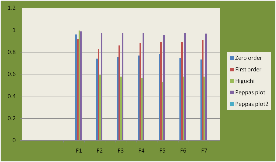 Fig. 11: Graph showing regression coefficient (R2) values of different kinetics models and diffusion exponent (n) of peppas model for moronic acid TDDS