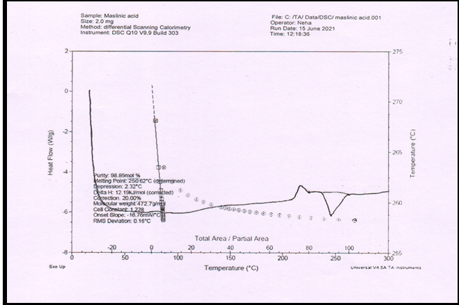 A single endothermic peak in case of Maslinic acid at 249.62 °C almost corresponds to its melting point as shown in fig. and table represents the different concentrations and their area under the curve for Maslinic acid by RP-HPLC method. This gives a standard curve with a linear regression equation and correlation coefficient as shown in fig. and table represents the different concentrations and their absorbance for Maslinic acid spectrophotometrically. This gives a standard curve with a linear regression equation and correlation coefficient, as shown in the figure.
