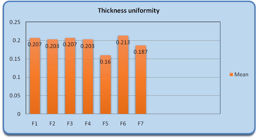 The aim of the present study was to check the uniformity of thickness of the formulated films. The thickness of the film was measured at 3 different points using a digital caliper and an average thickness of three reading was calculated.