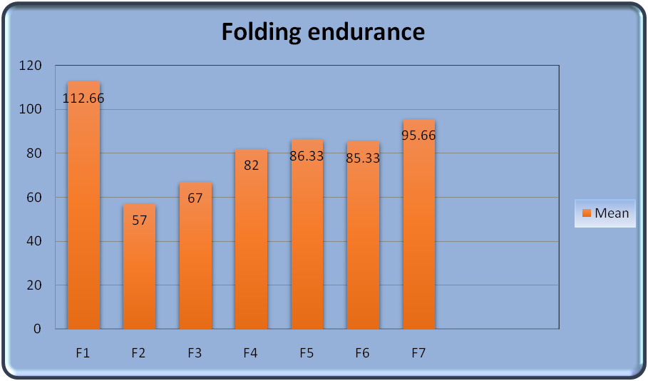The folding endurance was measured manually for the prepared films. A strip of film (5 x 5 cm) was cut and repeatedly folded at the same place till it broke. The number of times the film could be folded at the same place without breaking/cracking gave the value of folding endurance.