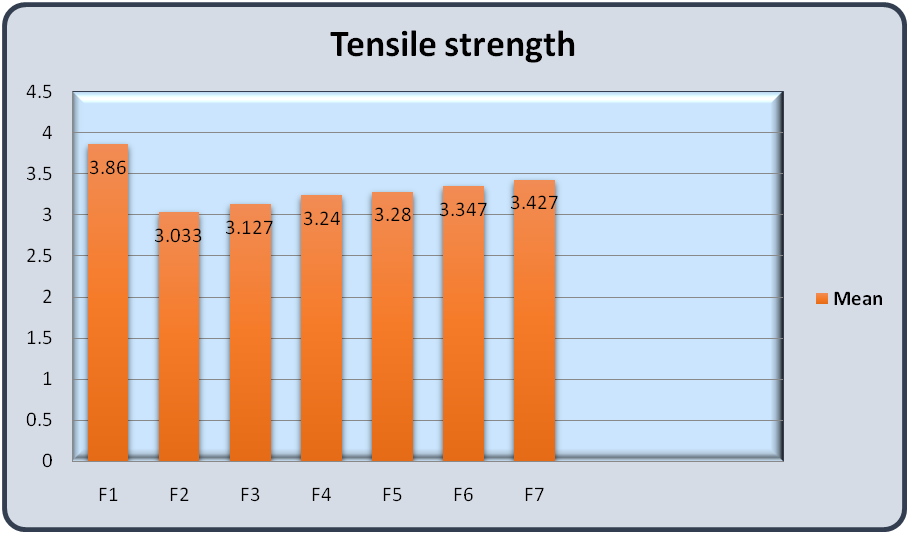 Tensile strength of the film was determined with a Universal strength testing machine (Hounsfield, Slinfold, Horsham, U. K.). The sensitivity of the machine was 1 gram. It consisted of two load cell grips. The lower one was fixed and the upper one was movable. The test film of size (4 × 1 cm2) was fixed between these cell grips and force was gradually applied till the film broke. The tensile strength of the film was taken directly from the dial reading in kg. Tensile strength is expressed as follows;