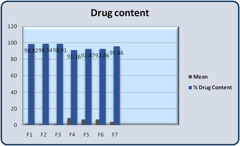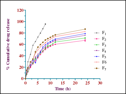 Conclusion: Various formulations were developed by using hydrophilic and hydrophobic polymers like HPMC E5 and EC respectively in single and combinations by solvent evaporation technique with the incorporation of penetration enhancer such as dimethylsulfoxide and dibutyl phthalate as plasticizer In vitro studies concluded that HPMC E5 patches has better release than that of EC patches, which may be attributed to high water vapour permeability of HPMC patches and hydrophobic nature of EC. An attempt was made to incorporate HPMC E5 and EC to the monolithic system for better release and prolong the duration of release. Formulation F7 containing an equal ratio of HPMC E5: EC (5:5) showed maximum and sustained release of 86.816±0.264 within 24 h. Kinetic models were used to confirm the release mechanism of the formulations. Maslinic acid release from the patches F1 to F7 followed non Fickian diffusion rate controlled mechanism.