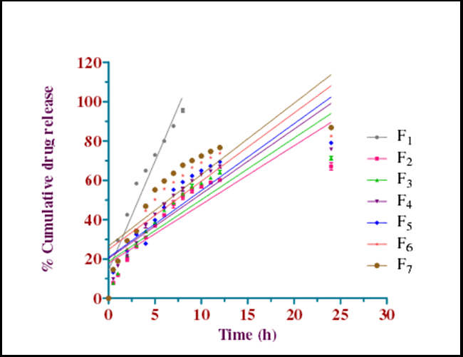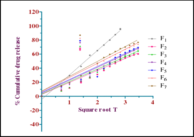The diffusion pattern release of the formulation was studied by plotting Higuchi’s graph using Cumulative % drug released against Square root of time.