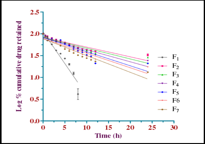 First-order graphs were made by using Log cumulative % drug remaining against Time in hours.
