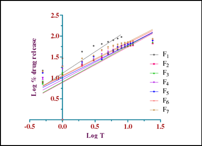 The Peppas exponential equation was explained by plotting a graph of Log of cumulative % drug release against Log time.